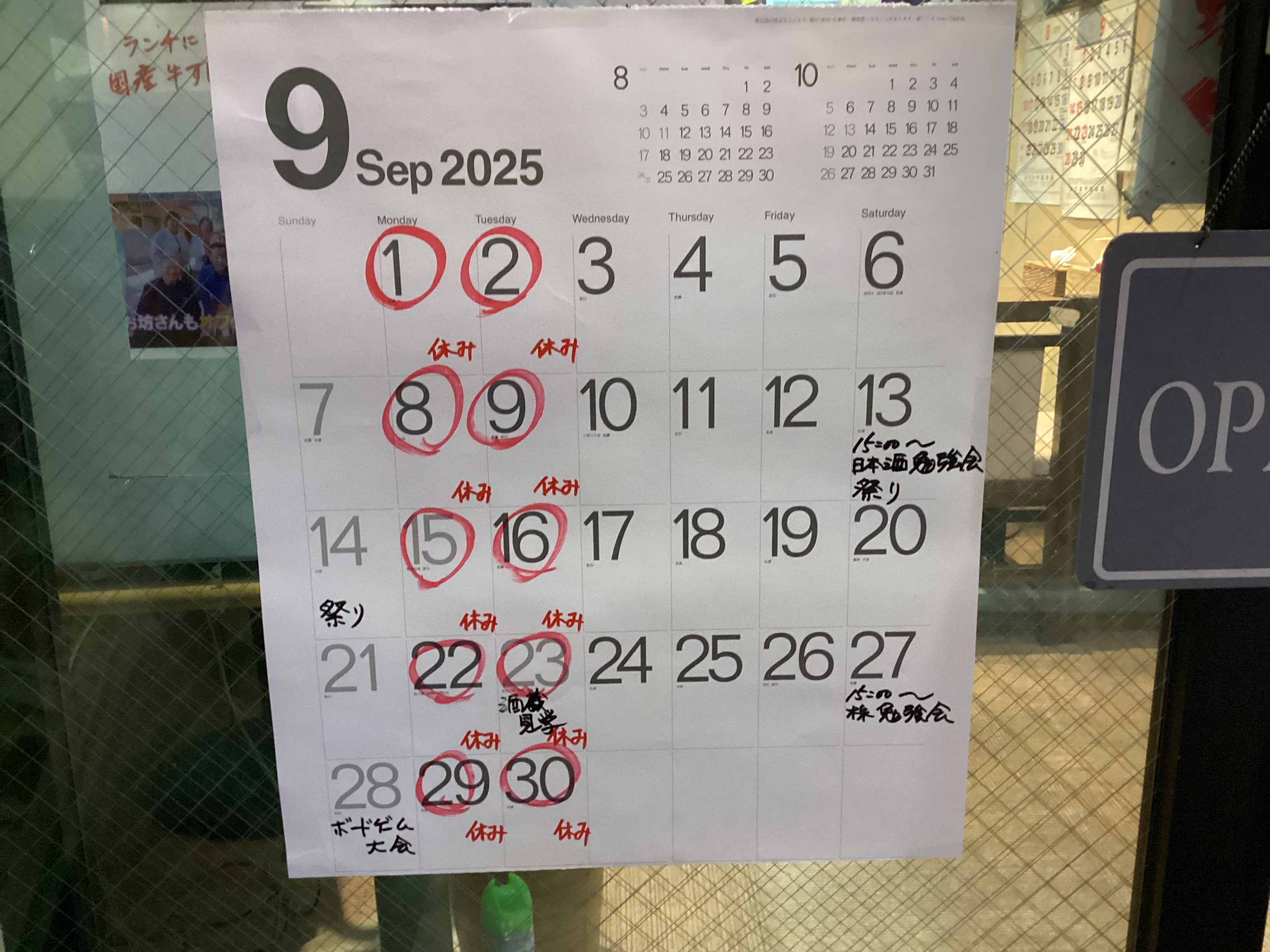 9月の定休日は、毎週月曜日、毎週火曜日となります。