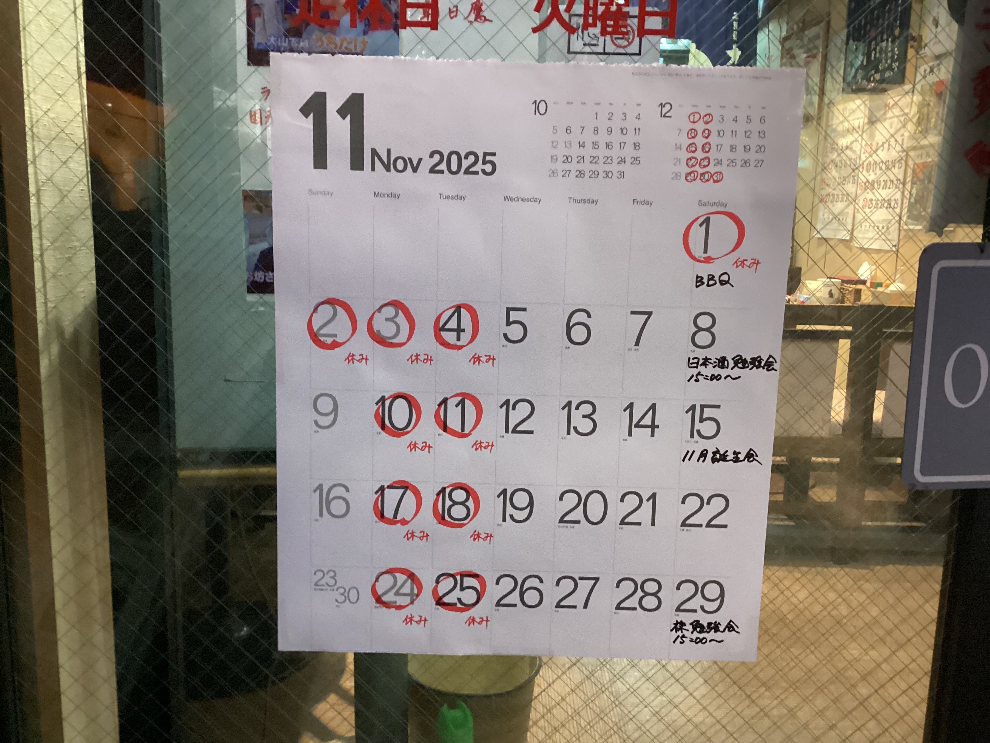 11月の定休日は、毎週火曜日と第1月曜日、第3月曜日となります。