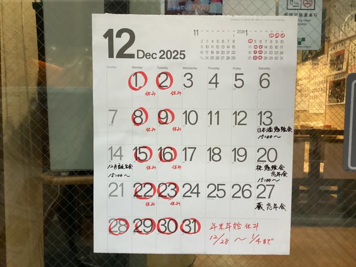 12月の定休日は、毎週火曜日と第1月曜日、第3月曜日となります。