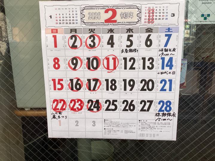 2月の定休日は、毎週火曜日と第1月曜日、第3月曜日となります。